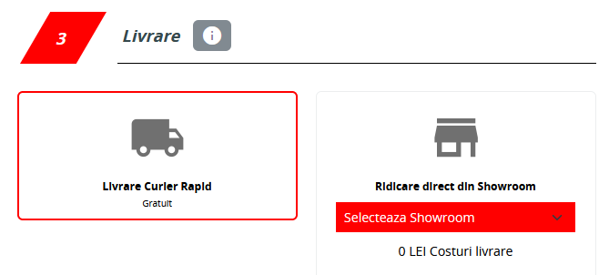 - Ridicare direct din Showroom – posibilitate de ridicare directă a comenzii direct din magazinele disponibile la selectarea Showroom-ului, fără a mai fi percepută taxa de transport.
