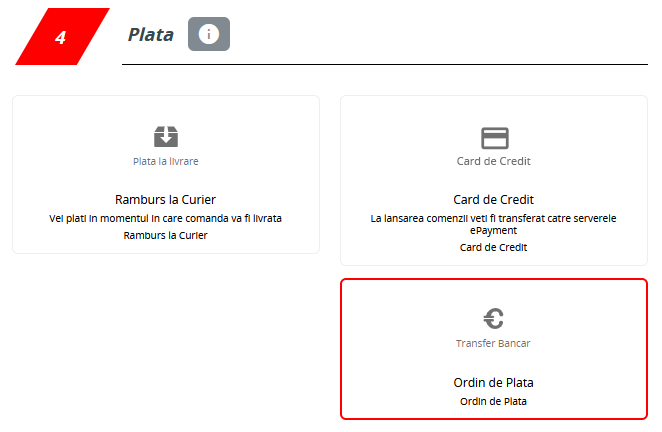 - Card de Credit – La lansarea comenzii veți fi transferat către serverele ePayment unde puteți efectua plata cu cardul