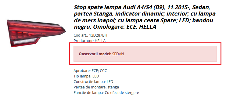 -Unele produse prezintă restricții ce fac referire la tipul de caroserie, model, motorizare. etc. Aceste restricții sunt evidențiate printr-un chenar roșu pe catalog sau pe pagina produsului.