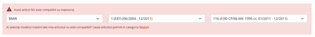 Dacă ați accesat pagina unui produs la care acesta nu este compatibil cu mașina selectată veți primi o notificare in partea de sus a paginii ce va semnalează acest lucru.